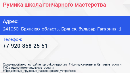 Румика, школа гончарного мастерства по адресу 241050, Брянская область, Брянск, бульвар Гагарина, 1 в дальнейшем Организация, размещена в следующих категориях:
