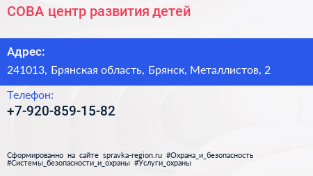 СОВА, центр развития детей по адресу 241013, Брянская область, Брянск, Металлистов, 2 в дальнейшем Организация, размещена в следующих категориях: