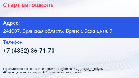 Старт, автошкола по адресу 241007, Брянская область, Брянск, Бежицкая, 7 в дальнейшем Организация, размещена в следующих категориях: