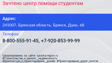 Зачтено, центр помощи студентам по адресу 241007, Брянская область, Брянск, Дуки, 68 в дальнейшем Организация, размещена в следующих категориях: