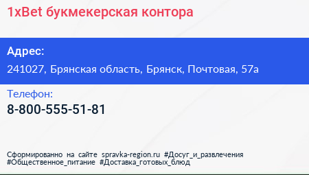 1xBet, букмекерская контора по адресу 241027, Брянская область, Брянск, Почтовая, 57а в дальнейшем Организация, размещена в следующих категориях: