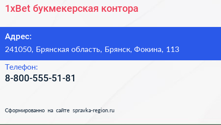1xBet, букмекерская контора по адресу 241050, Брянская область, Брянск, Фокина, 113 в дальнейшем Организация, размещена в следующих категориях: