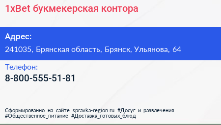 1xBet, букмекерская контора по адресу 241035, Брянская область, Брянск, Ульянова, 64 в дальнейшем Организация, размещена в следующих категориях: