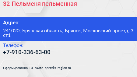 32 Пельменя, пельменная по адресу 241020, Брянская область, Брянск, Московский проезд, 3 ст1 в дальнейшем Организация, размещена в следующих категориях:
