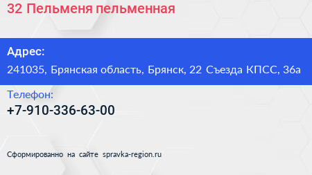32 Пельменя, пельменная по адресу 241035, Брянская область, Брянск, 22 Съезда КПСС, 36а в дальнейшем Организация, размещена в следующих категориях: