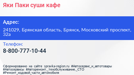 Яки Паки, суши-кафе по адресу 241029, Брянская область, Брянск, Московский проспект, 32а в дальнейшем Организация, размещена в следующих категориях: