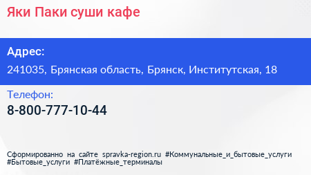Яки Паки, суши-кафе по адресу 241035, Брянская область, Брянск, Институтская, 18 в дальнейшем Организация, размещена в следующих категориях:
