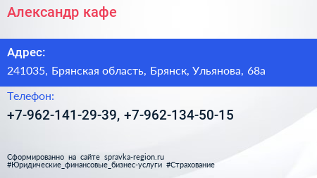 Александр, кафе по адресу 241035, Брянская область, Брянск, Ульянова, 68а в дальнейшем Организация, размещена в следующих категориях: