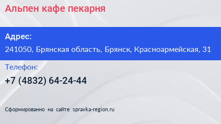 Альпен, кафе-пекарня по адресу 241050, Брянская область, Брянск, Красноармейская, 31 в дальнейшем Организация, размещена в следующих категориях: