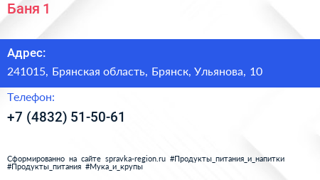 Баня №1 по адресу 241015, Брянская область, Брянск, Ульянова, 10 в дальнейшем Организация, размещена в следующих категориях: