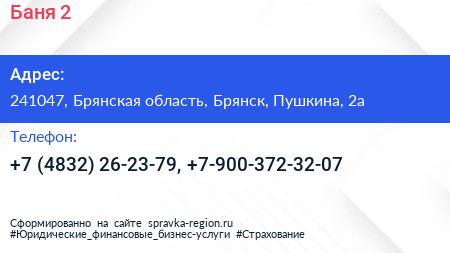 Баня №2 по адресу 241047, Брянская область, Брянск, Пушкина, 2а в дальнейшем Организация, размещена в следующих категориях: