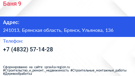 Баня №9 по адресу 241013, Брянская область, Брянск, Ульянова, 136 в дальнейшем Организация, размещена в следующих категориях: