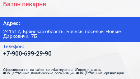 Батон, пекарня по адресу 241517, Брянская область, Брянск, посёлок Новые Дарковичи, 7Б в дальнейшем Организация, размещена в следующих категориях: