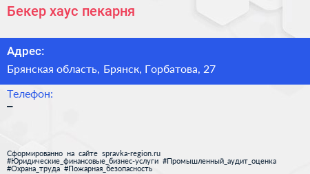 Бекер хаус, пекарня по адресу Брянская область, Брянск, Горбатова, 27 в дальнейшем Организация, размещена в следующих категориях:
