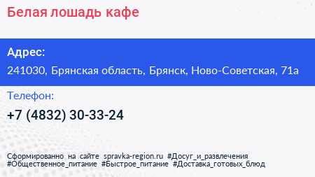 Белая лошадь, кафе по адресу 241030, Брянская область, Брянск, Ново-Советская, 71а в дальнейшем Организация, размещена в следующих категориях: