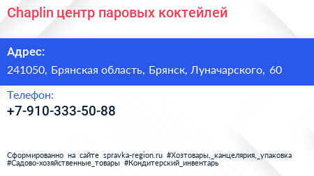Chaplin, центр паровых коктейлей по адресу 241050, Брянская область, Брянск, Луначарского, 60 в дальнейшем Организация, размещена в следующих категориях: