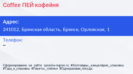 Coffee ПЕЙ, кофейня по адресу 241012, Брянская область, Брянск, Орловская, 1 в дальнейшем Организация, размещена в следующих категориях: