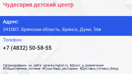 Чудесария, детский центр по адресу 241007, Брянская область, Брянск, Дуки, 56в в дальнейшем Организация, размещена в следующих категориях: