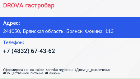 DROVA, гастробар по адресу 241050, Брянская область, Брянск, Фокина, 113 в дальнейшем Организация, размещена в следующих категориях: