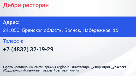 Дебри, ресторан по адресу 241050, Брянская область, Брянск, Набережная, 16 в дальнейшем Организация, размещена в следующих категориях: