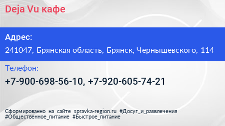 Deja Vu, кафе по адресу 241047, Брянская область, Брянск, Чернышевского, 114 в дальнейшем Организация, размещена в следующих категориях: