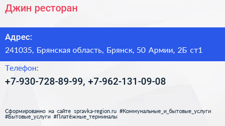Джин, ресторан по адресу 241035, Брянская область, Брянск, 50 Армии, 2Б ст1 в дальнейшем Организация, размещена в следующих категориях: