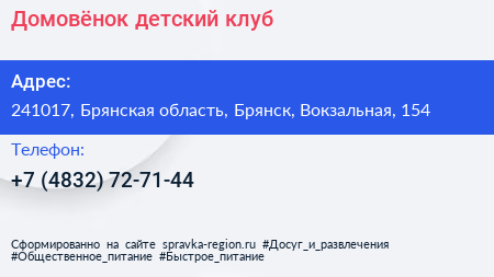 Домовёнок, детский клуб по адресу 241017, Брянская область, Брянск, Вокзальная, 154 в дальнейшем Организация, размещена в следующих категориях: