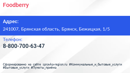 Foodberry по адресу 241007, Брянская область, Брянск, Бежицкая, 1/5 в дальнейшем Организация, размещена в следующих категориях: