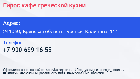 Гирос, кафе греческой кухни по адресу 241050, Брянская область, Брянск, Калинина, 111 в дальнейшем Организация, размещена в следующих категориях: