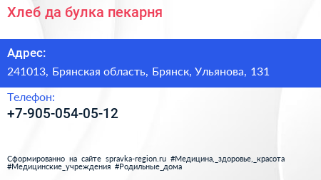 Хлеб да булка, пекарня по адресу 241013, Брянская область, Брянск, Ульянова, 131 в дальнейшем Организация, размещена в следующих категориях: