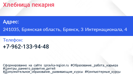 Хлебница, пекарня по адресу 241035, Брянская область, Брянск, 3 Интернационала, 4 в дальнейшем Организация, размещена в следующих категориях:
