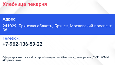 Хлебница, пекарня по адресу 241029, Брянская область, Брянск, Московский проспект, 36 в дальнейшем Организация, размещена в следующих категориях: