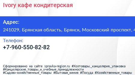Ivory, кафе-кондитерская по адресу 241029, Брянская область, Брянск, Московский проспект, 4 в дальнейшем Организация, размещена в следующих категориях: