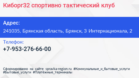 Киборг32, спортивно-тактический клуб по адресу 241035, Брянская область, Брянск, 3 Интернационала, 2 в дальнейшем Организация, размещена в следующих категориях: