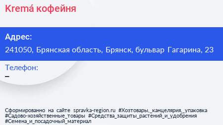 Kremá, кофейня по адресу 241050, Брянская область, Брянск, бульвар Гагарина, 23 в дальнейшем Организация, размещена в следующих категориях: