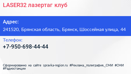 LASER32, лазертаг-клуб по адресу 241520, Брянская область, Брянск, Шоссейная улица, 44 в дальнейшем Организация, размещена в следующих категориях:
