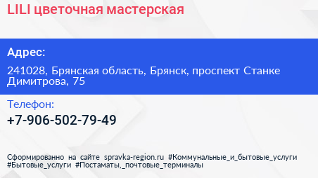 LILI, цветочная мастерская по адресу 241028, Брянская область, Брянск, проспект Станке Димитрова, 75 в дальнейшем Организация, размещена в следующих категориях: