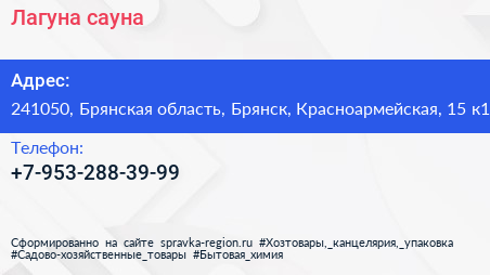 Лагуна, сауна по адресу 241050, Брянская область, Брянск, Красноармейская, 15 к1 в дальнейшем Организация, размещена в следующих категориях: