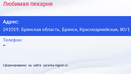Любимая пекарня по адресу 241019, Брянская область, Брянск, Красноармейская, 80/1 в дальнейшем Организация, размещена в следующих категориях: