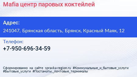 Mafia, центр паровых коктейлей по адресу 241047, Брянская область, Брянск, Красный Маяк, 12 в дальнейшем Организация, размещена в следующих категориях: