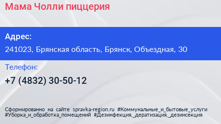 Мама Чолли, пиццерия по адресу 241023, Брянская область, Брянск, Объездная, 30 в дальнейшем Организация, размещена в следующих категориях: