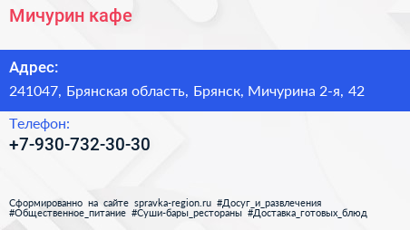 Мичурин, кафе по адресу 241047, Брянская область, Брянск, Мичурина 2-я, 42 в дальнейшем Организация, размещена в следующих категориях: