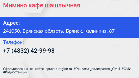 Мимино, кафе-шашлычная по адресу 241050, Брянская область, Брянск, Калинина, 87 в дальнейшем Организация, размещена в следующих категориях: