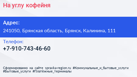 На углу, кофейня по адресу 241050, Брянская область, Брянск, Калинина, 111 в дальнейшем Организация, размещена в следующих категориях: