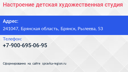 Настроение, детская художественная студия по адресу 241047, Брянская область, Брянск, Рылеева, 53 в дальнейшем Организация, размещена в следующих категориях: