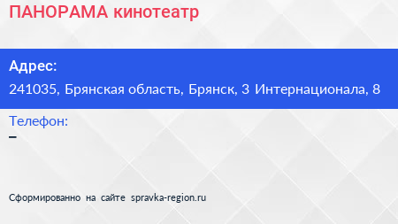 ПАНОРАМА, кинотеатр по адресу 241035, Брянская область, Брянск, 3 Интернационала, 8 в дальнейшем Организация, размещена в следующих категориях: