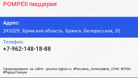 POMPEII, пиццерия по адресу 241029, Брянская область, Брянск, Белорусская, 31 в дальнейшем Организация, размещена в следующих категориях: