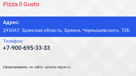 Pizza il`Gusto по адресу 241047, Брянская область, Брянск, Чернышевского, 72Б в дальнейшем Организация, размещена в следующих категориях: