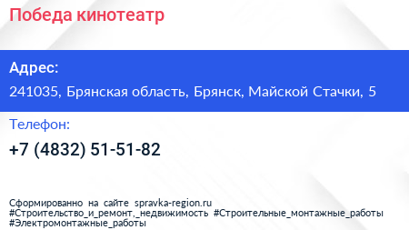 Победа, кинотеатр по адресу 241035, Брянская область, Брянск, Майской Стачки, 5 в дальнейшем Организация, размещена в следующих категориях: