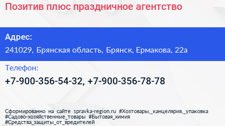Позитив плюс, праздничное агентство по адресу 241029, Брянская область, Брянск, Ермакова, 22а в дальнейшем Организация, размещена в следующих категориях: